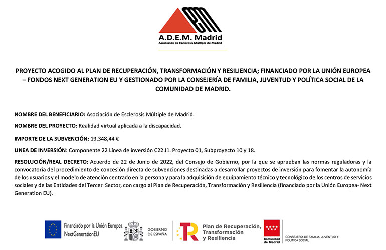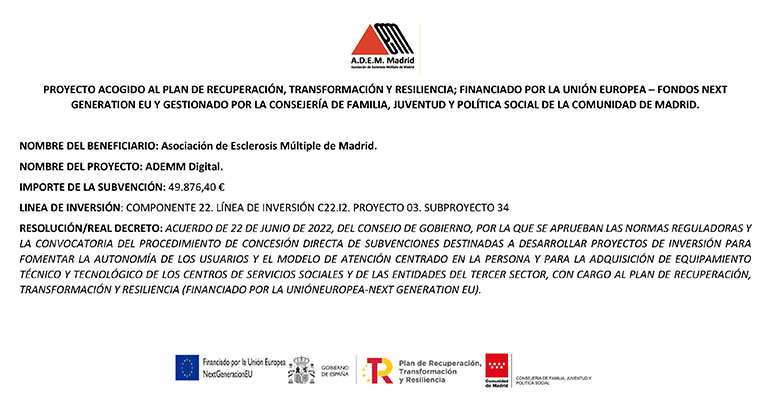 En 2021, ADEMM ha recibido ayuda financiera para compensar los gastos ocasionados como consecuencia de la crisis social y sanitaria que ha desencadenado la COVID-19, de la Comunidad de Madrid y de la Unión Europea a través del FSE, como parte de la respuesta de la Unión a la pandemia de COVID-19.